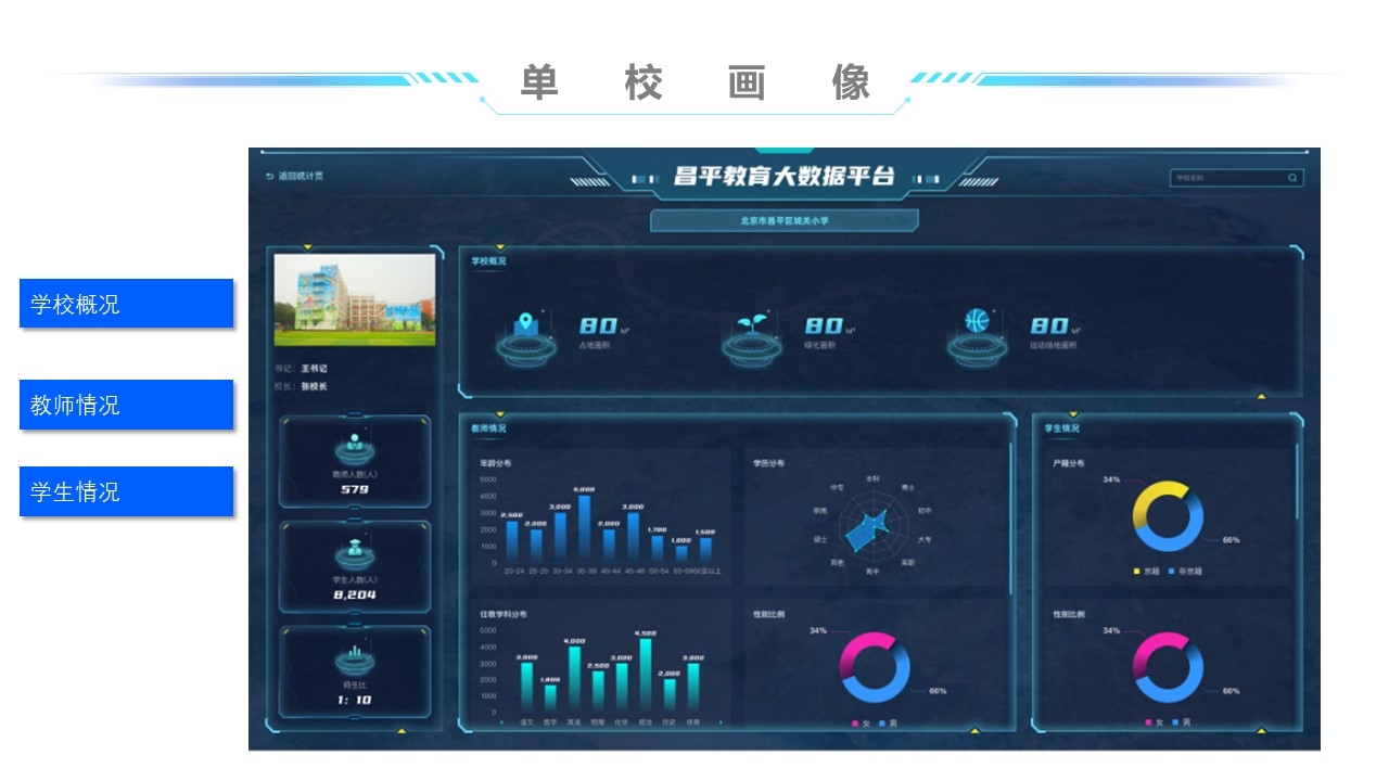 学校画像统计并呈现全区学校的办学条件、队伍建设、学业发展、教育理念、学校规划、学校特色、学校制度建设、学校成就、校友人才库、素质教育、课程建设、学校资源等模块。